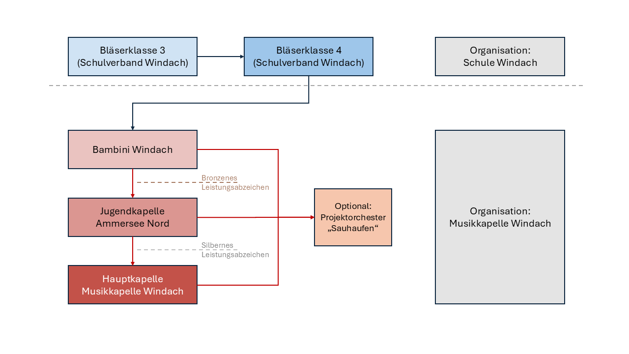 Die Jugendarbeit ist unserem Verein sehr wichtig, da ohne Nachwuchs der Verein keine Zukunft hat. Hierbei arbeiten wir mit den benachbarten Kapellen aus Eresing, Türkenfeld, Eching und Schondorf und der Schule Windach sehr eng zusammen. Mit diesen Kapellen betreiben wir gemeinsam die beiden Jugendblasorchester.